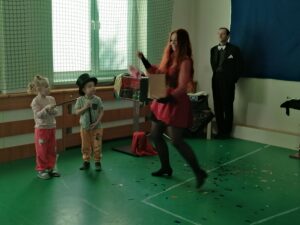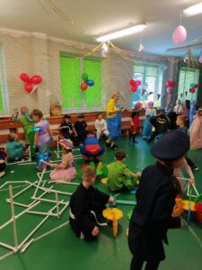 Dzieci wystąpiły w pięknych i kolorowych strojach. Na sali gimnastycznej było wiele zabawy przy muzyce razem z panią animatorką. Nie zabrakło także zdjęć indywidualnych i grupowych.